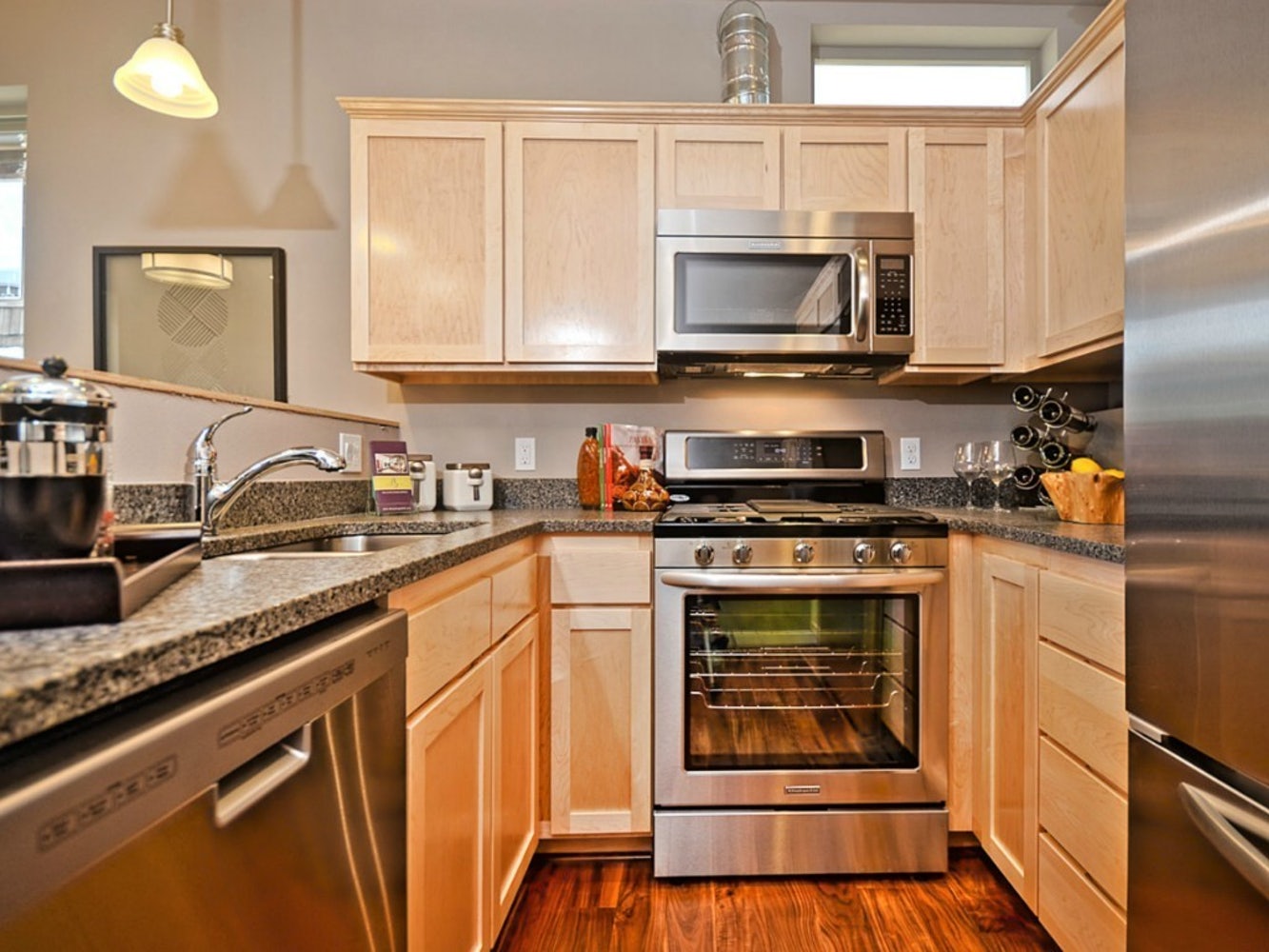 Stainless appliances and gas range in the kitchen, tankless water heater and laundry room